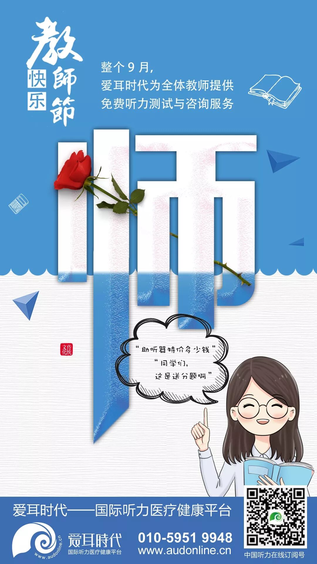 9月10日 ON SEPTEMBER 10 教师节 爱耳时代在2019年教师节来临之际,向全国教师致敬。爱耳时代也想在自己的专业领域为老师们做点力所能及的事。所以,我们决定在9-10月里,为老师们免费提供听力检查。 免费听力检查对象:在职教师、退休教师、现在或曾经从事教育相关事业人员。 免费听力检查内容: (1)终身听力健康管理档案 (2)全套纯音听力检查 (3)耳镜检查 (4、可选)助听器试戴与评估 (5)听力健康保健咨询 时间:2019年9-10月 联系方式与听力中心地址: 【北京中心】010-5948 8191(工作日10:00-17:00) 北京市东城区崇文门外大街3号新世界中心B座10层1016 【成都中心】028-8543 2435(工作日10:00-17:00) 成都市武侯区小天竺街75号财富国际8层808 — END — 爱耳时代·听力中心 爱耳君工作微信:aiershidai 邮箱:aier@audonline.cn